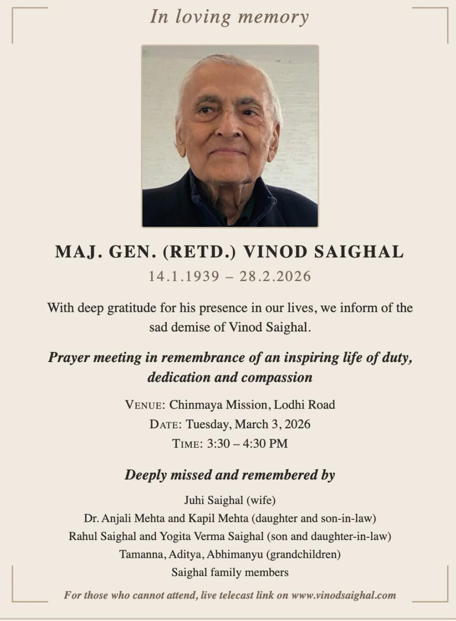 General Vinod Saighal retired from the Indian Army in 1995 from the post of Director General Military Training. He has held an assignment with the UN peacekeeping forces as well as a tenure in Iran. He had served as the country's Military Attache in France and BENELUX, also overseeing Spain and Portugal..........Vinod Saighal was invited to join the 'Institutional Advisory Board' of USFSS (US Federation of Scientists and Scholars) in 2000. He is international consultant since 1995 with the prestigious French think tank Centre d'Etude et de Prospective Strategique (CEPS) as well as on the Institutional Advisory Board of an Italian Publication Geopolitica. He was a special invitee of the Chinese Medical Association as keynote presenter for the final plenary session of the 16th World Conference of IPPNW (International Physicians for Prevention of Nuclear War) in Beijing in 2004.